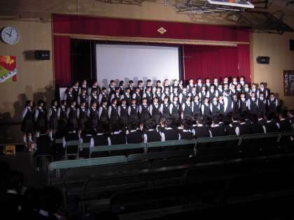 2番目は、2年生の全体合唱と選抜メンバーによる合唱。選抜メンバーによる合唱では、南相馬市立小高中学校の卒業式で歌われた「群青」を歌いました(左写真)。この曲の詩は、当時の3年生が、元気を取り戻そうとして作詞したものです。その前向きな姿勢に感動した2年生も、仲間をテーマにして自分たちで作詞し、「空も飛べるはず」のメロディーにのせて「永遠の仲間」を合唱しました(右写真)。