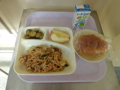 本日のメニューは、オイスターソース焼きそば、きゅうりの中華あえ、黒糖パン、リンゴ、牛乳 です。