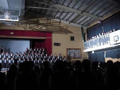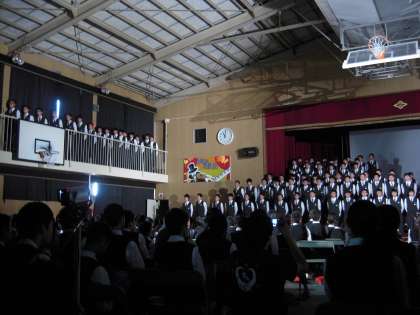 3番目は、3年生の群読とフォトモザイク。群読の詩は、合唱コンクールの曲としてもよく演奏される「名づけられた葉」にしようと、3年生が決めました。そこには、巣立っていく決意の詩にしたいという3年生の思いがあったからです。先ず3年生自作の群読説明ビデオを放映してから、乱れ読みという手法も使いながら呼吸を合わせた堂々たる群読を披露してくれました。フォトモザイクは、入学してから撮影した写真を約2000枚張り合わせて1枚のモザイク画に仕上げたものです。(写真は、学校だより:神無月の風・2に掲載しておりますので、そちらをご覧ください)