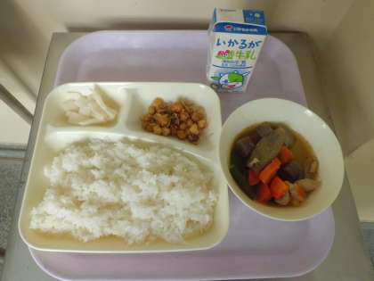 本日のメニューは、鶏肉と野菜の煮物、じゃこ豆、かぶのゆず風味、ご飯、牛乳 です。