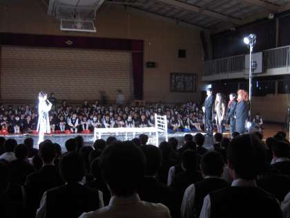 25日(土)の午前中に、土曜授業の一環として演劇鑑賞を体育館で行いました。演題は「賢治の贈り物」。主人公が、宮澤賢治の作品の中にある言葉を使いながら、心を閉ざした女性シンガーを変えていくというストーリーです。詳しくは学校だより:神無月の風・3をご覧ください。