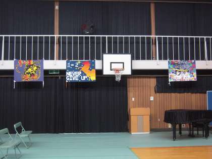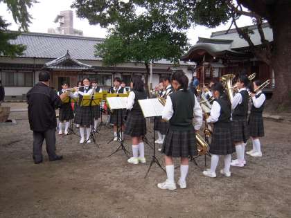 小雨が心配された11月2日(日)の午前、吹奏楽部は深江歴史文化まつりに招かれ、アンパンマンなど15分間の演奏を披露してくれました。また、翌日の3日(月)にはまつりの会場になった深江小学校体育館に、本校体育大会応援旗12枚も展示してもらいました。