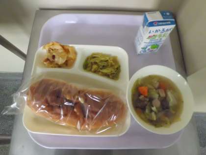 本日のメニューは、ポトフ、カレーソテー、、おさつパン、桃のクラフティ、牛乳 です。