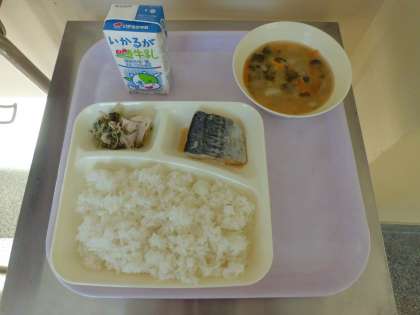 本日のメニューは、さごしの醤油だれかけ、みずなの煮びたし、味噌汁、ご飯、牛乳 です。