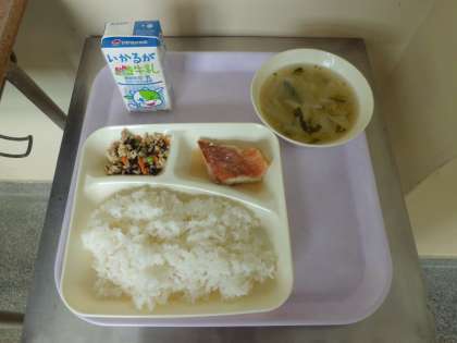 本日のメニューは、あかうおの醤油たれかけ、うすくず汁、高野豆腐の炒り煮、ご飯、牛乳 です。