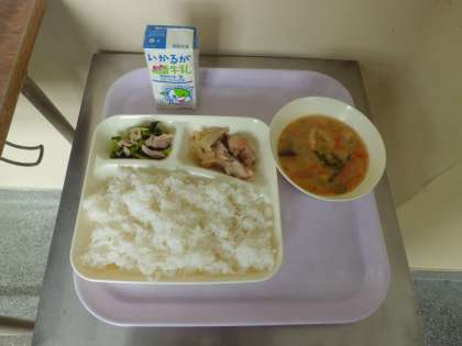 本日のメニューは、鶏肉のゆず塩焼き、小松菜の煮びたし、さつまいもの味噌汁、ご飯、牛乳 です。