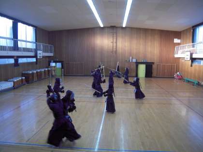 11月に入って始まった武道場の天井撤去工事は、足場も組み終って着々と進んでいます(左写真)。その間、剣道部は深江小学校の体育館をお借りして練習をしています。年明け1月からは体育館の工事が始まりますが、その間は宝栄小学校の体育館をお借りする予定です。