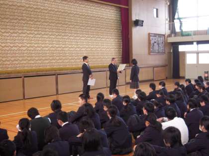 前日の雨も上がった7日の朝に、体育館にて3学期の始業式を行いました。元気に揃った全校生徒の前で、生徒会・吹奏楽部の感謝状・表彰状を伝達し、元日の雪を吉事の前兆ととらえて生徒の皆さんにとっても吉事の多い年になりますように、とお話ししました。また、昨日から寒に入ったので、寒さに負けず、風邪等にも負けずに乗り切ろう、と呼びかけました。