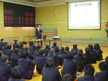 6日(金)の午後1時から、2年生は薬物乱用防止教室の授業を、武道場で受講。講師は大阪府警察本部よりお越しいただき、中央少年サポートセンター制作の新作DVDの映像とご講話によって、身も心も滅ぼす薬物の恐ろしさとそこから身を守る大切さを学びました。今年は警察官4名だけでなく、テレビ局・新聞社からも取材に来られ、この教室の社会的重要性も感じることができました。