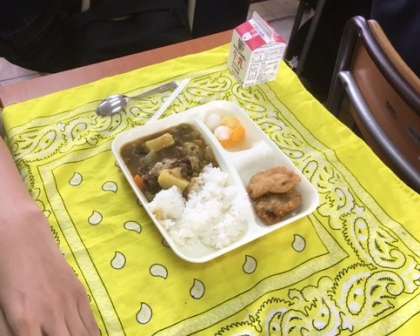 今日の給食は、入学お祝い献立の「カツカレーライス・牛乳・フルーツ白玉」でした。