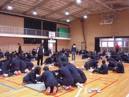 3月5日(木)の午後、昨日に続いて今度は2年生が百人一首大会を体育館にて行いました。昨年は五十首での大会を行い、今年は本格的に百首での大会です。16枚の畳を各クラスが混合した16の班がそれぞれ取り囲み、班ごとに100枚の札をとり合いましたが、やはり昨年よりも素早くとれるようになっています。集中力を高めようと1回戦のみで行いましたが、その結果は、4組の優勝、3組の準優勝となりました。でも、実力は伯仲です。日常を忘れさせる箏の調べと短歌のリズムに触れながら、伝統文化を楽しんだ2日間でした。