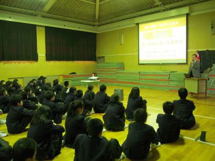 3月6日(金)の5時限目、1年生は、ネット犯罪から身を守るため、携帯電話の安全教室を受講しました。悪ふざけの写真をアップしたために高額の賠償請求を受けた事例など、現実の被害をアニメ風に紹介しながら注意点を説明していただきましたので、生徒の皆さんにはよく解ってもらえたと思います。特に、一度流失したした個人情報はいつまでも残るという怖さは、とても印象的でした。