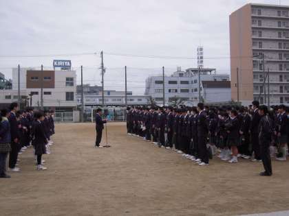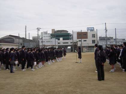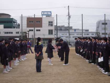 今にも泣きだしそうな曇り空の3月9日(月)の朝、全学年が揃う最後の全校集会で表彰状の伝達を行ったあと、生徒会主導で卒業生を送る会が行われました。在校生代表が「一層活躍をしてください」とエールを送れば(左写真)、卒業生代表は「東陽中学校をもっと良くしていってください」と希望を託しました(右写真)。相互にあいさつを終えると、卒業式当日に胸に着けてもらおうと2年生が手間暇をかけて手作りで仕上げたコサージュを、記念品として贈りました(中央写真)。