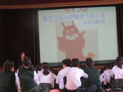 1年生 体育館で「いじめの正体とは」の学習をしました。