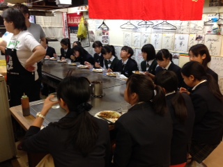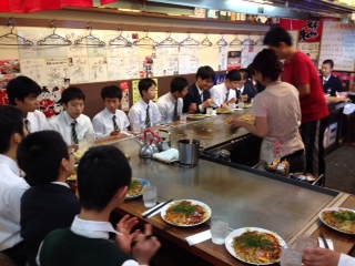 広島「お好み村」で昼食をとりました。各クラス男女とも違う店で、広島焼を食べ、とてもおいしく最高でした。色々な店があり、楽しかったです。