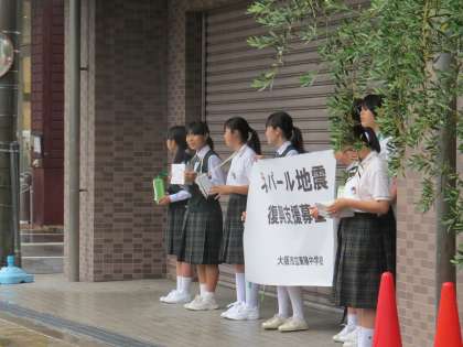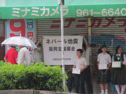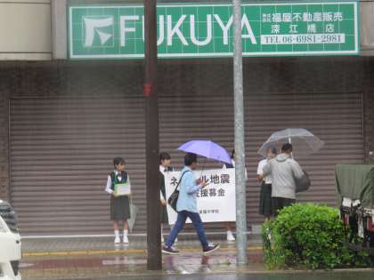 6月3日(水)雨のなか 2日目になる深江橋駅前 ネパール大地震支援募金活動では、駅前の少し屋根のある所で、行いました。降りしきる雨のなか、車の音と雨の音に負けない声で「支援募金お願いします」のまごころからの募金活動は続きました。