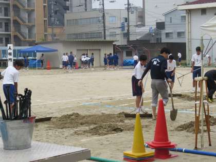 運動場にしみ込んだ水を スコップで掘り返し、 スポンジで水を吸い取り 3時間。