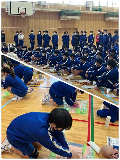 区役所の方、日本赤十字社、東成消防署の方を講師に、HUGゲーム(避難所運営シミュレーションゲーム)、救命講習、水消火器体験、ロープワーク、簡易担架を行い、防災意識を高めました。