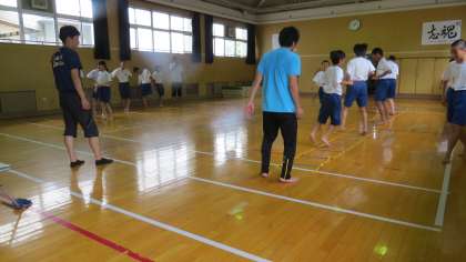 格技室で中学校の先生の指導で、深江小、宝栄小の先生がたで、「はじごトレーニング」を行いました。小学校でできる、足のつま先を敏速に動かし、はしごを渡る。細かいトレーニングを取り入れていきたいと思います(小学校先生 談)