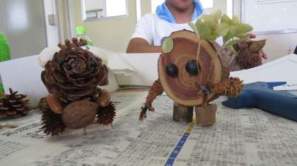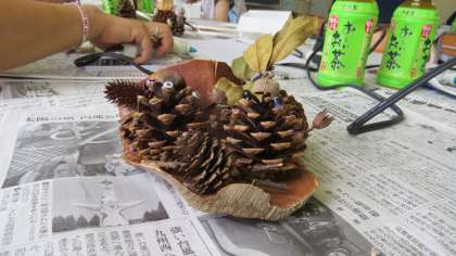 夏期交流交講座 2 「クラフト」 森林インストラクターの先生の指導で、「人と森 森と森 人と人をづなぐ」ことを大切に、たくさんの木の実をつかって作品づくりを行いました。