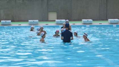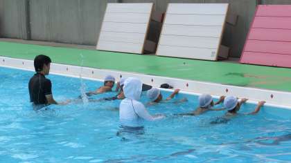 小学校の夏期水泳指導に参加しています、3年生のまだ、泳ぎが苦手な児童への指導をしています。