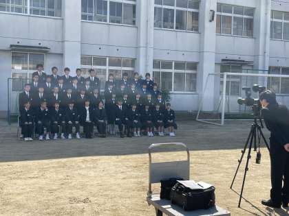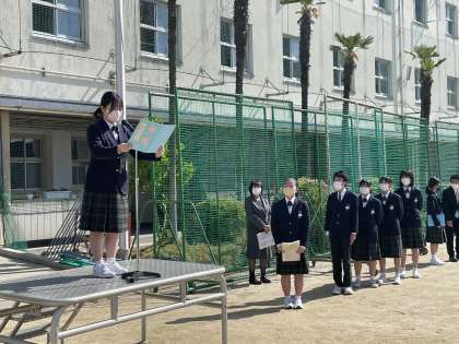 クラス発表の後、グラウンドで着任式、始業式、対面式が行われ、始業式では学級担任や学年主任、学年所属の先生の発表がありました。