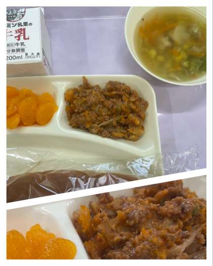 じゃがいものミートグラタン、レタスのスープ、みかん(缶)と黒糖パン、牛乳
