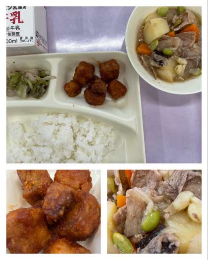 まぐろのオーロラ煮、豚肉と野菜の煮もの、キャベツの赤じそあえとごはん、牛乳