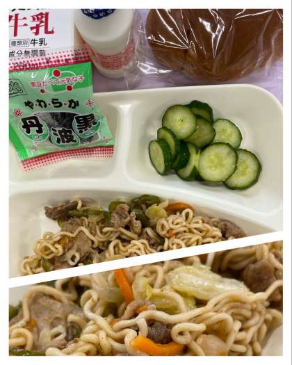焼きそば、ソフト黒豆、発酵乳、きゅうりのしょうがづけと黒糖パン(小)、牛乳