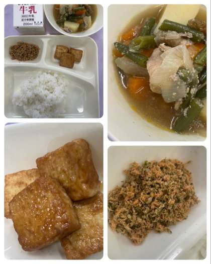 鶏肉とじゃがいもの煮もの、あつあげのしょうゆだれかけ、紅ざけそぼろ