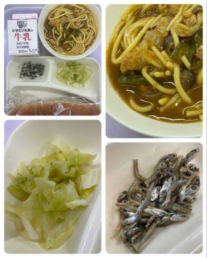 カレースープスパゲッティ、キャベツのピクルス、ミニフィッシュ