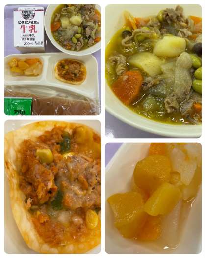 豚肉と野菜のカレースープ煮、変わりピザ、ミックスフルーツ(缶)