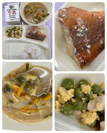 あかうおのしょうゆだれかけ、みそ汁、えんどうの卵とじ