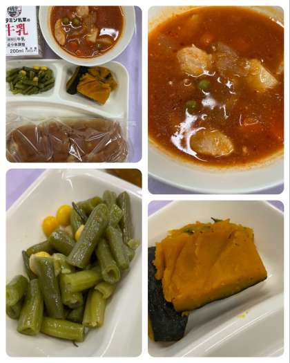 ケチャップ煮、さんどまめとコーンのソテー、焼きかぼちゃの甘みつかけ