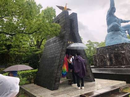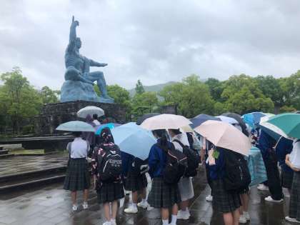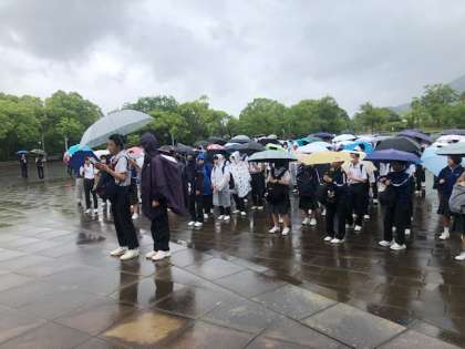 雨が降る中、平和公園で平和セレモニーを行い、千羽鶴を奉納しました。