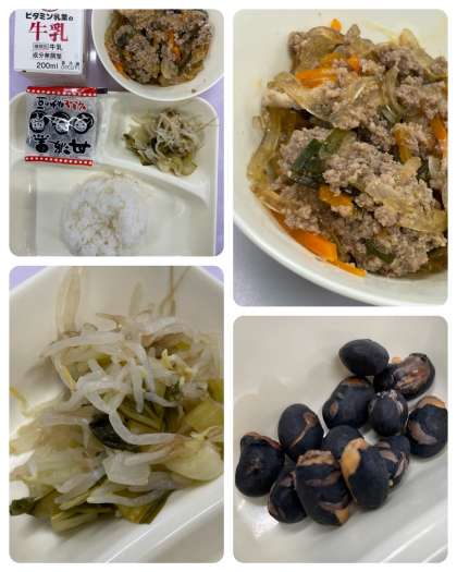 マーボーはるさめ、チンゲンサイともやしの甘酢あえ、いり黒豆