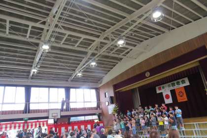 深江幼稚園「南中ソーラン」深江小学校4年生「北の国から、いろんな木の実」を見ていただきました。