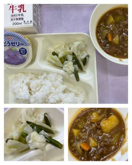 ビーフカレーライス[米粉]、野菜のピクルス、ぶどうゼリー