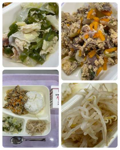 他人丼、ささみと野菜の炒め物、もやしの甘酢和え