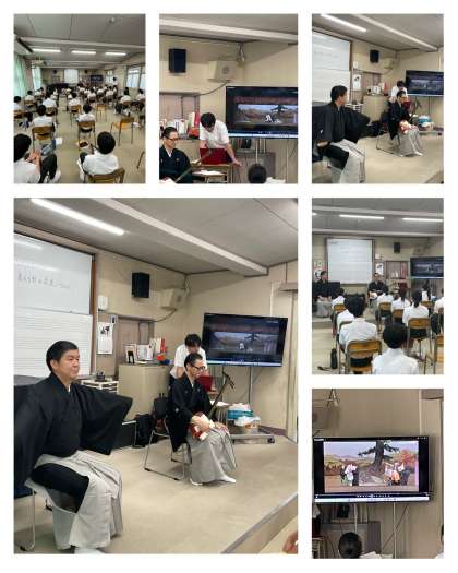 人形浄瑠璃文学座より太夫の豊竹芳穂太夫様、三味線奏者の鶴澤友之助様にお越しいただいて文楽の授業を行って頂きました。