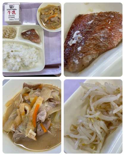 赤魚の醤油たれかけ、豚汁、もやしのゆずの香り和え