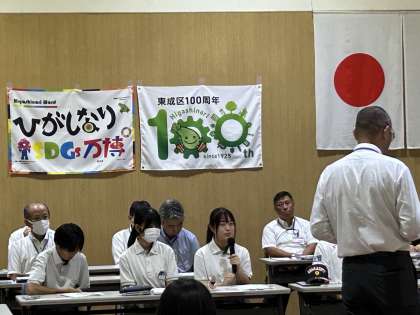 今回のひがしなり未来会議では東成区の4中学校の代表生徒と区長、東成消防署長、地域の方々が集まり防災について各校で検討したことを発表し合いました。