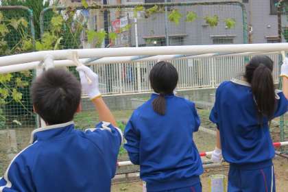 小学校では ペンキ塗り、花うえ 落ち葉集め