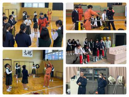 1年生は東成消防署の「地震体験」、「ロープワーク」、「水消火器」、「簡易担架」の体験