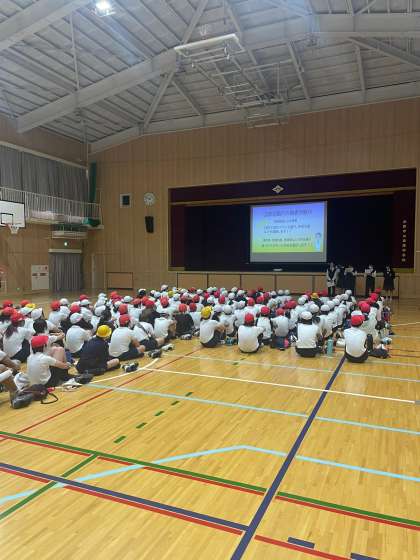 午後から深江小学校、宝栄小学校6年生に向けて生徒会からの「中学校生活の説明」、その後「部活動体験」を行いました。