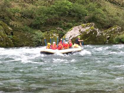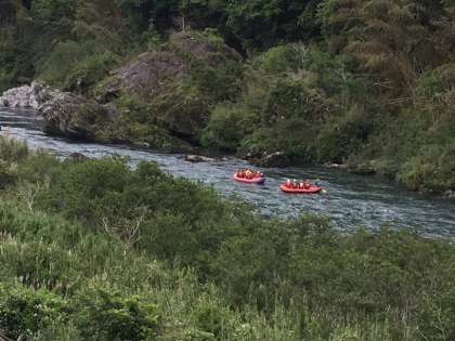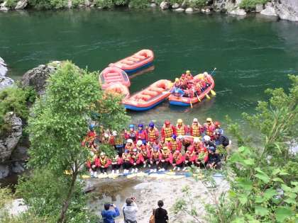 朝は雨でしたが、ラフティングを始めるころには晴れ間が出てきました。世界的にもトップクラスの激流、四国吉野川は深緑色の森と水、真っ白な雲に取り囲まれ、この大自然が東陽中の子どもたちの心を癒してくれたことでしょう。