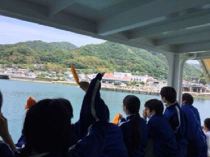 離島式を終え、予定通りに大崎上島の港を出港しました。2日間だけでしたが、お世話になった民泊の家族の皆様との別れの時がやってきました。短い期間でしたが、いっしょに生活をし、行動を共にし、親切にしていただいたので情が移り、涙する生徒がたくさんいました。お互いに黄色いハンカチでさよならするのが伝統のようです。