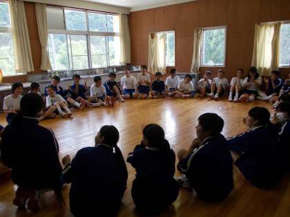 ・島から島へロープを使ってわたるゲームをした。その時得意な子が苦手な子にアドバイスをしていたり、みんなで渡ってくる子をロープから降ろしたり、足をけがしている子を心配したりとたくさん思いやっていて団結できた瞬間だと思いました。