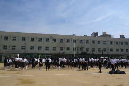 全校集会 教育実習で3名の卒業生が3週間がんばります(6月6日)