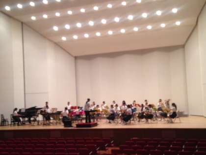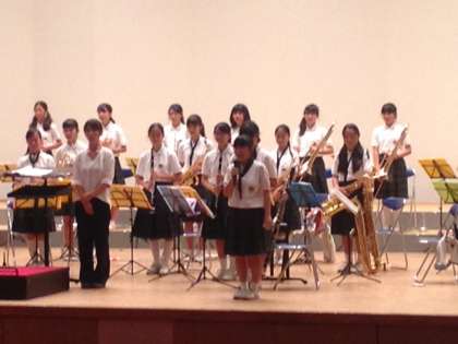 7月24日(日)、東成区PTA協議会主催で、東成区4中学校吹奏楽部による発表会が区民センター大ホールで行われました。これは、吹奏楽コンクール地区大会を目前に控え、大舞台での練習と本番の雰囲気を感じるための実際の演奏が目的でした。東陽中学校は、「動物の謝肉祭」(C.サンサーンス作曲)を本番さながらに演奏しました。むずかしい曲でしたが、全員が力を合わせ見事な演奏で、仕上がりは順調です!本番も期待ができそうです。